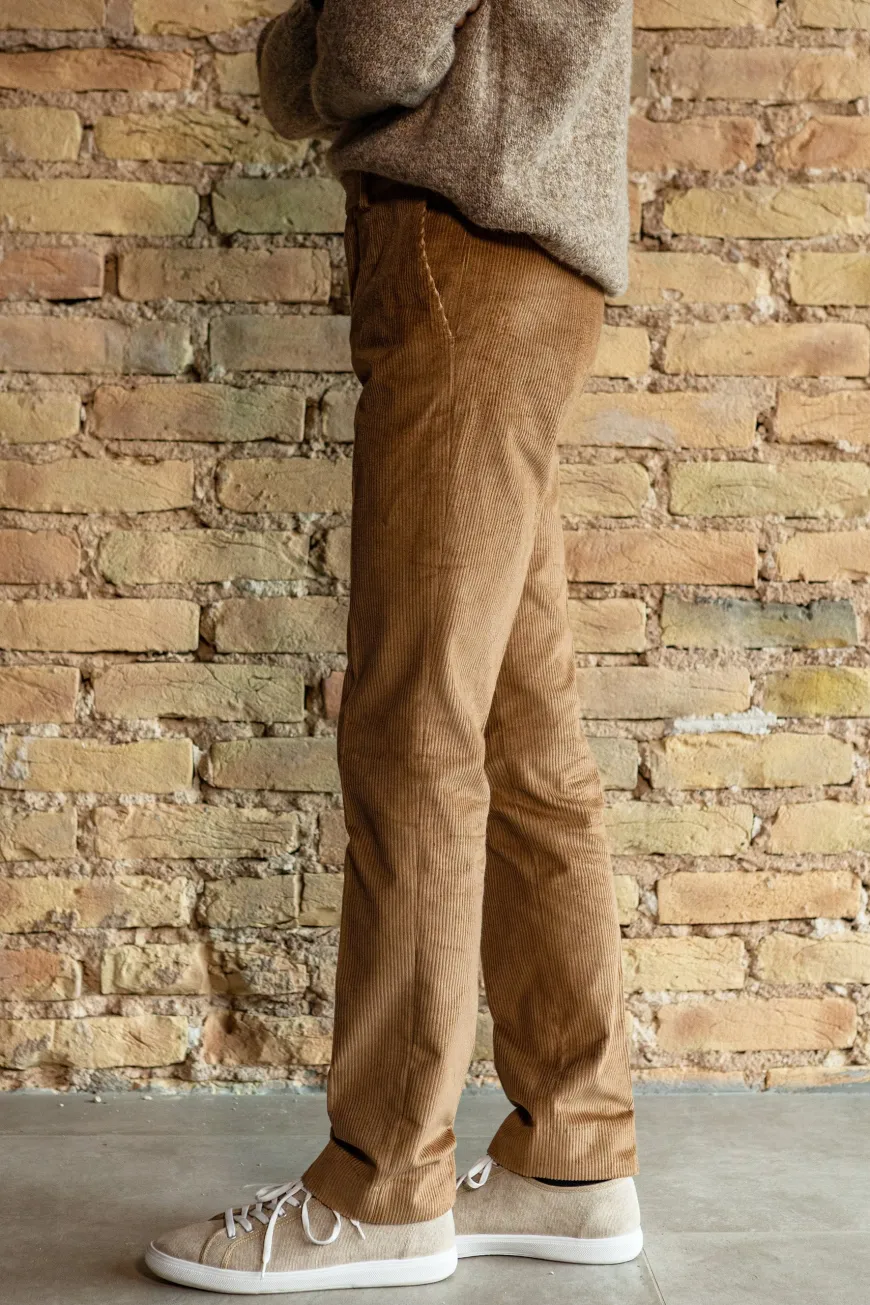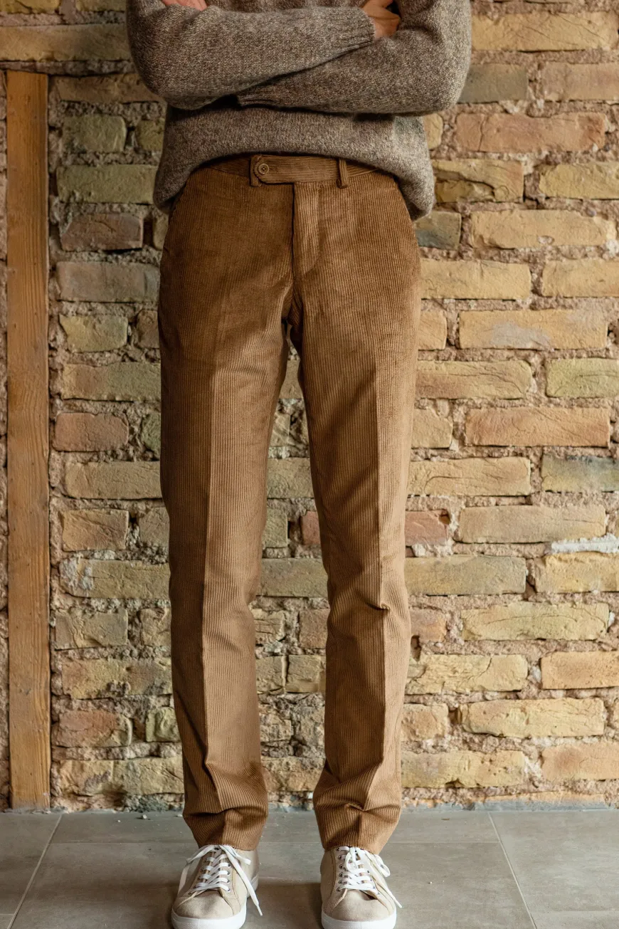 Inspiré du vestiaire vintage, ce pantalon en velours côtelé de caractère est agréable à porter. Il se distingue par les larges côtes de corduroy provenant du célèbre tisseur anglais Brisbane. Pièce robuste faite pour résister dans le temps et traverser les saisons. Existe aussi en marine.