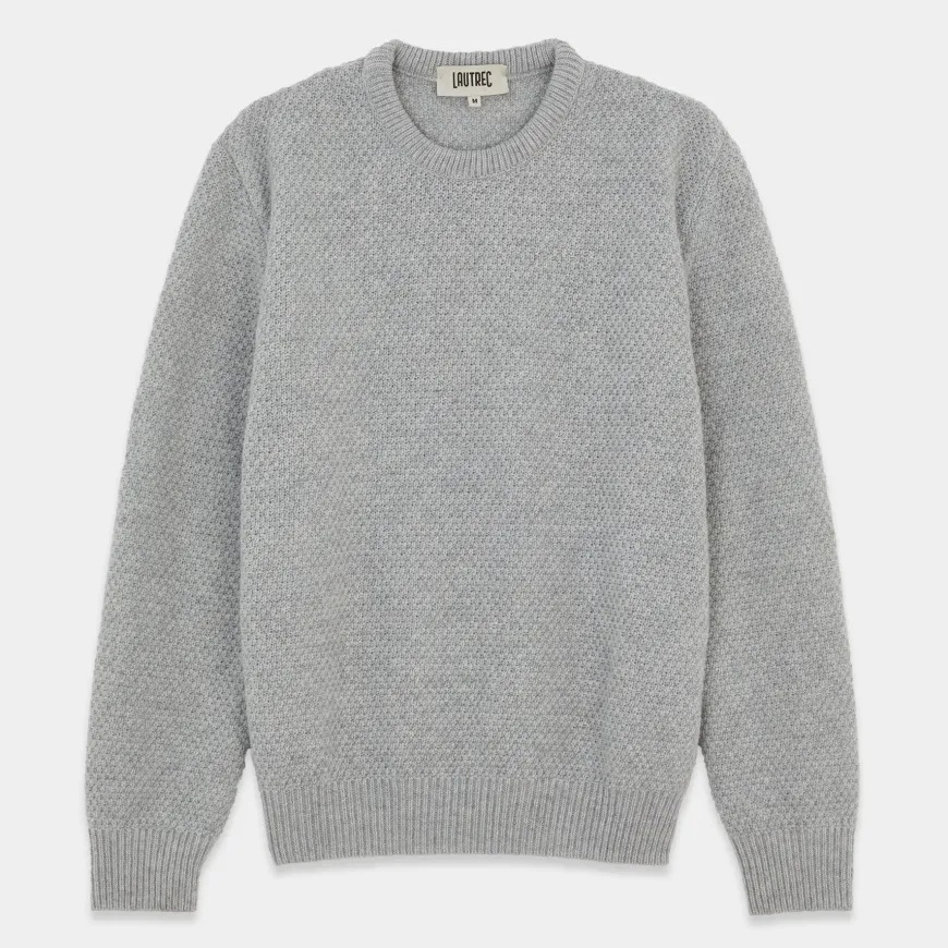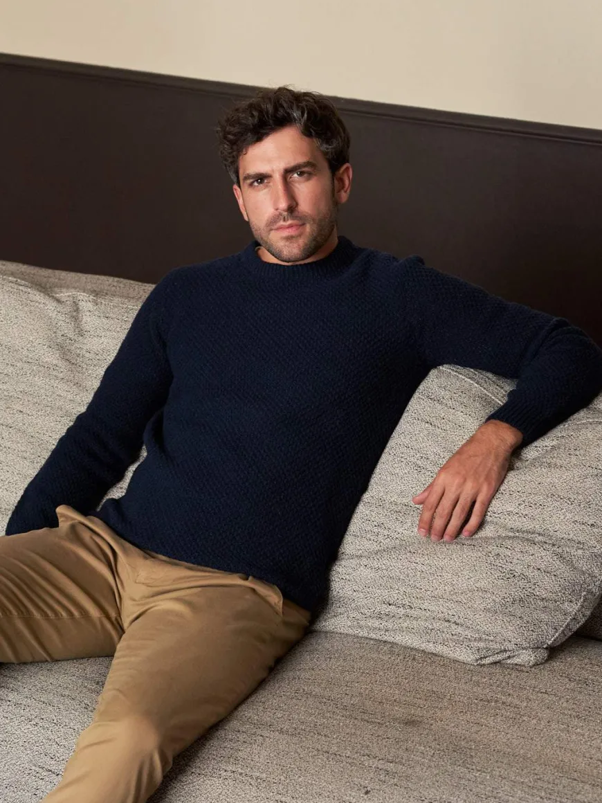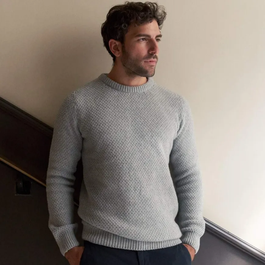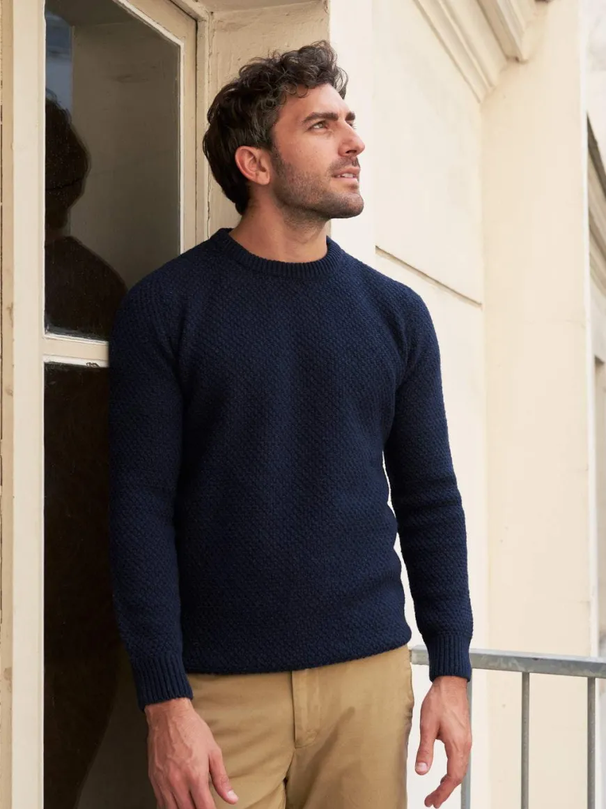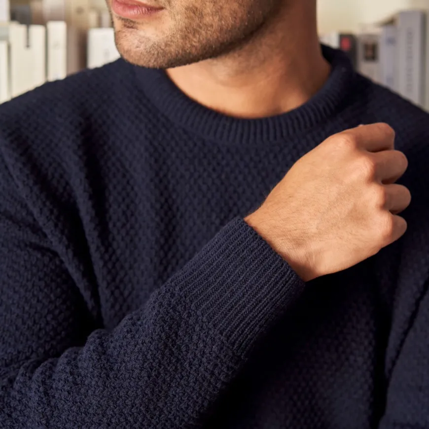 Ce pull texturé en laine recyclée est une pièce intersaison. Il se marie aussi bien en vestiaire casual avec un chino, qu’en look plus formel au-dessus d’une chemise avec un pantalon de ville.