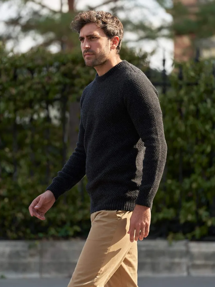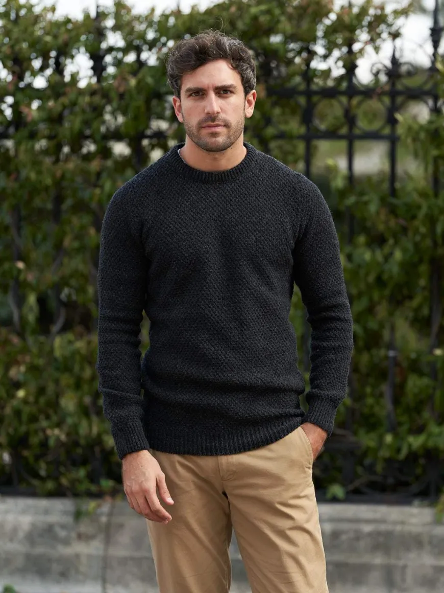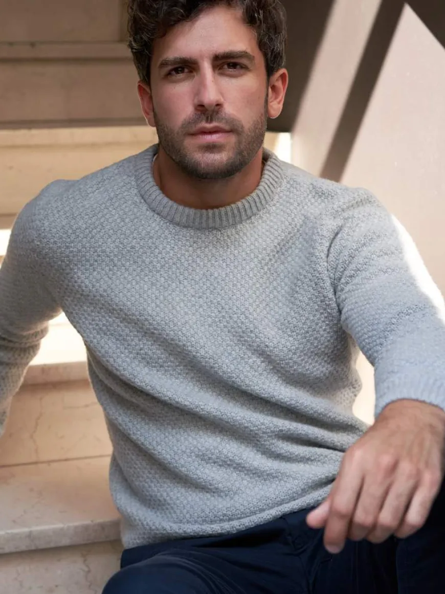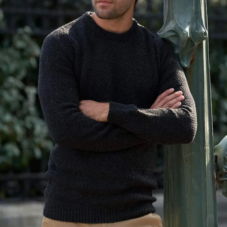 Ce pull texturé en laine recyclée est une pièce intersaison. Il se marie aussi bien en vestiaire casual avec un chino, qu’en look plus formel au-dessus d’une chemise avec un pantalon de ville.