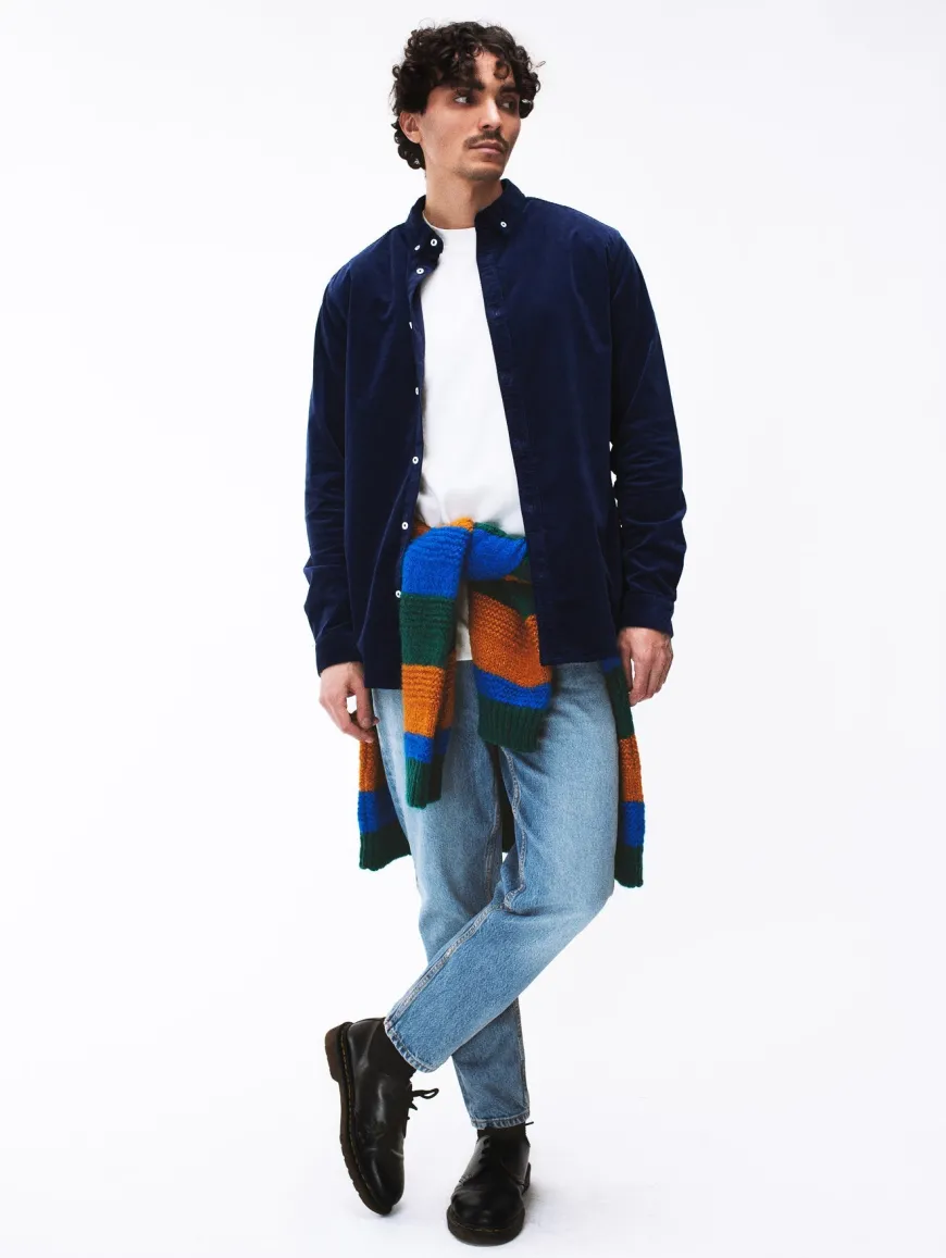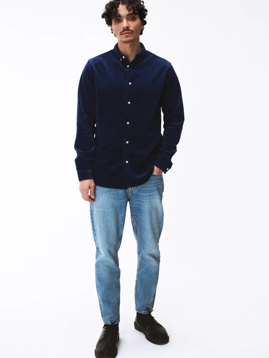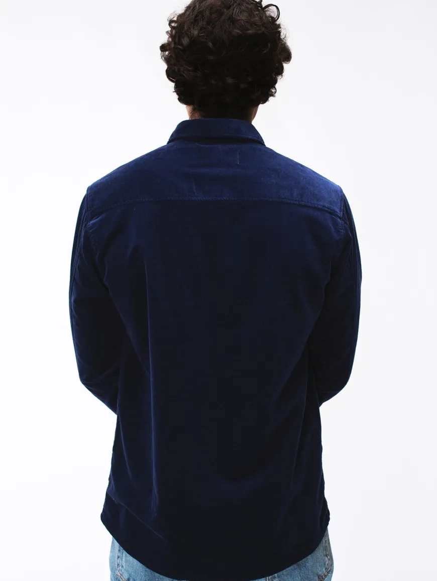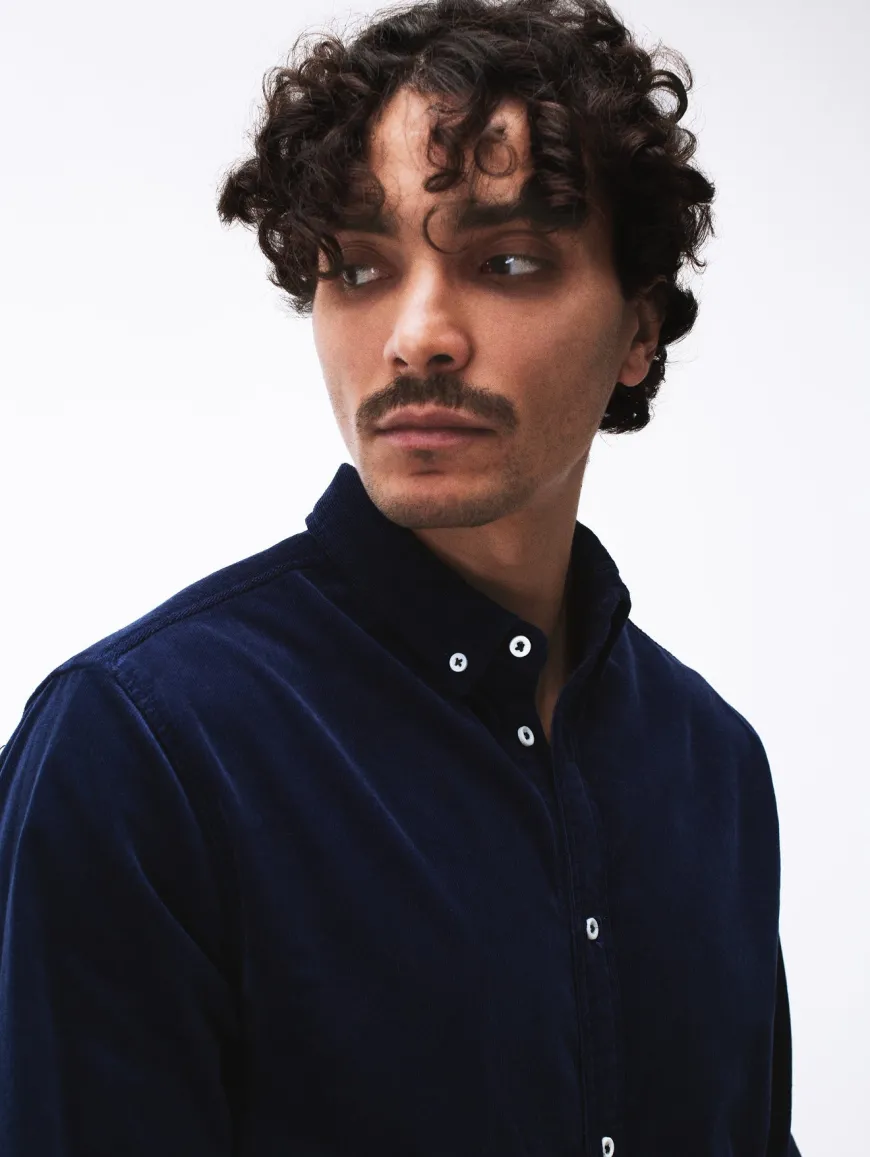 Chemise ou surchemise pour homme en velours côtelé milleraies. Col français boutonné et patte de boutonnage apparente. Velours fines côtes en coton 100% biologique tissé en Allemagne.