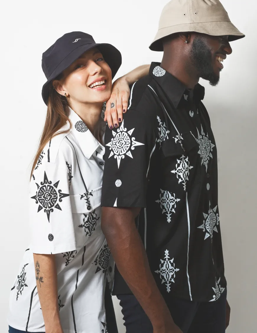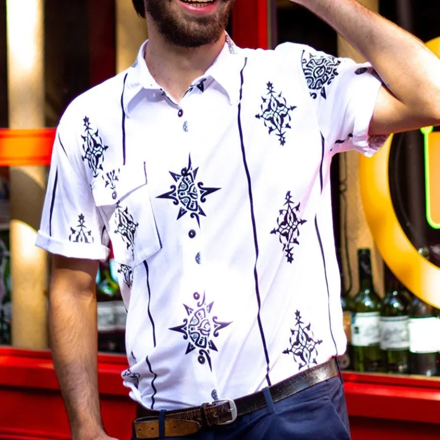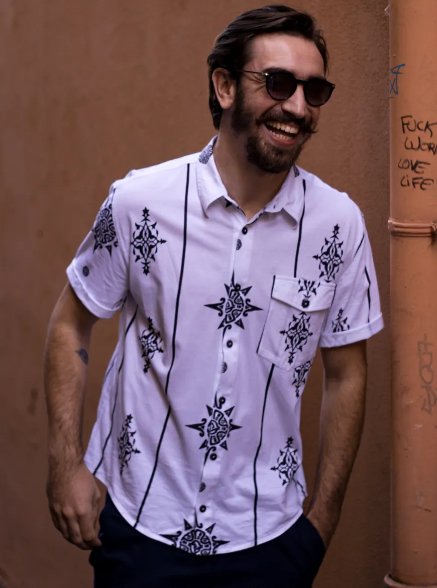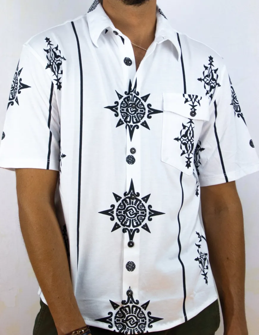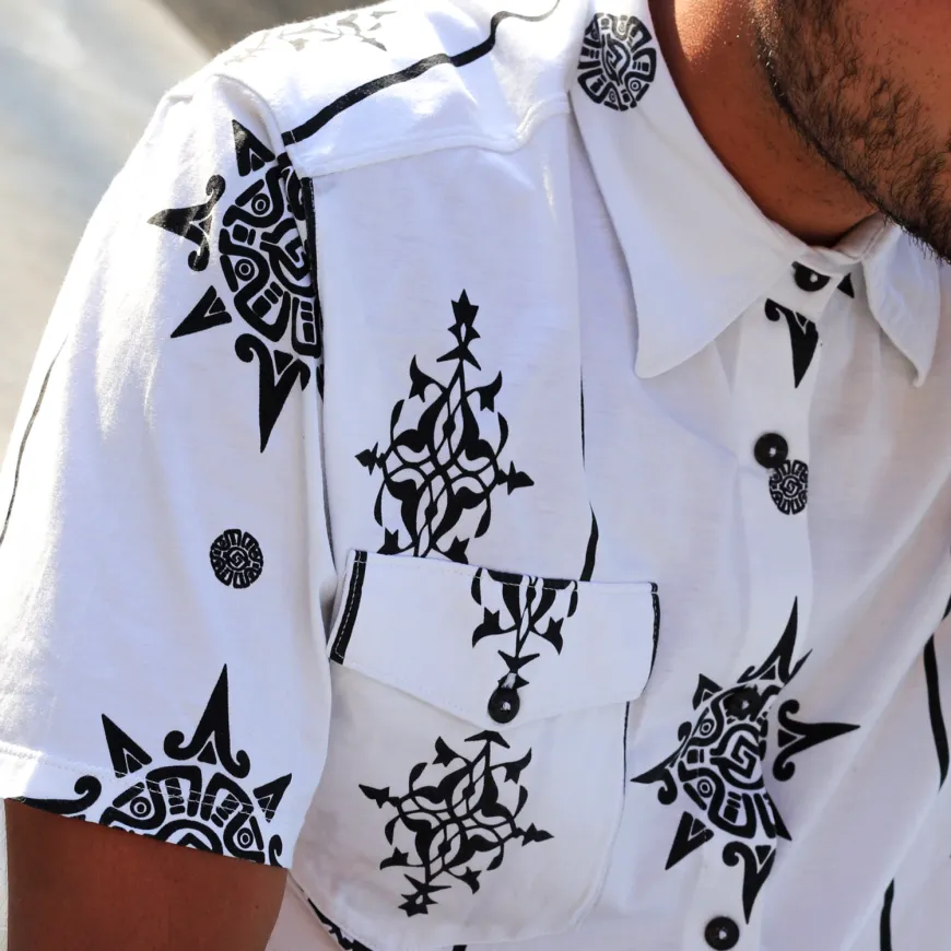 Envie d’une touche d’Amérique du Sud pour twister un look casual cet été ? Voici la chemise manches-courtes en coton pima biologique, motifs inspiration Mayas, par Palasaña.
