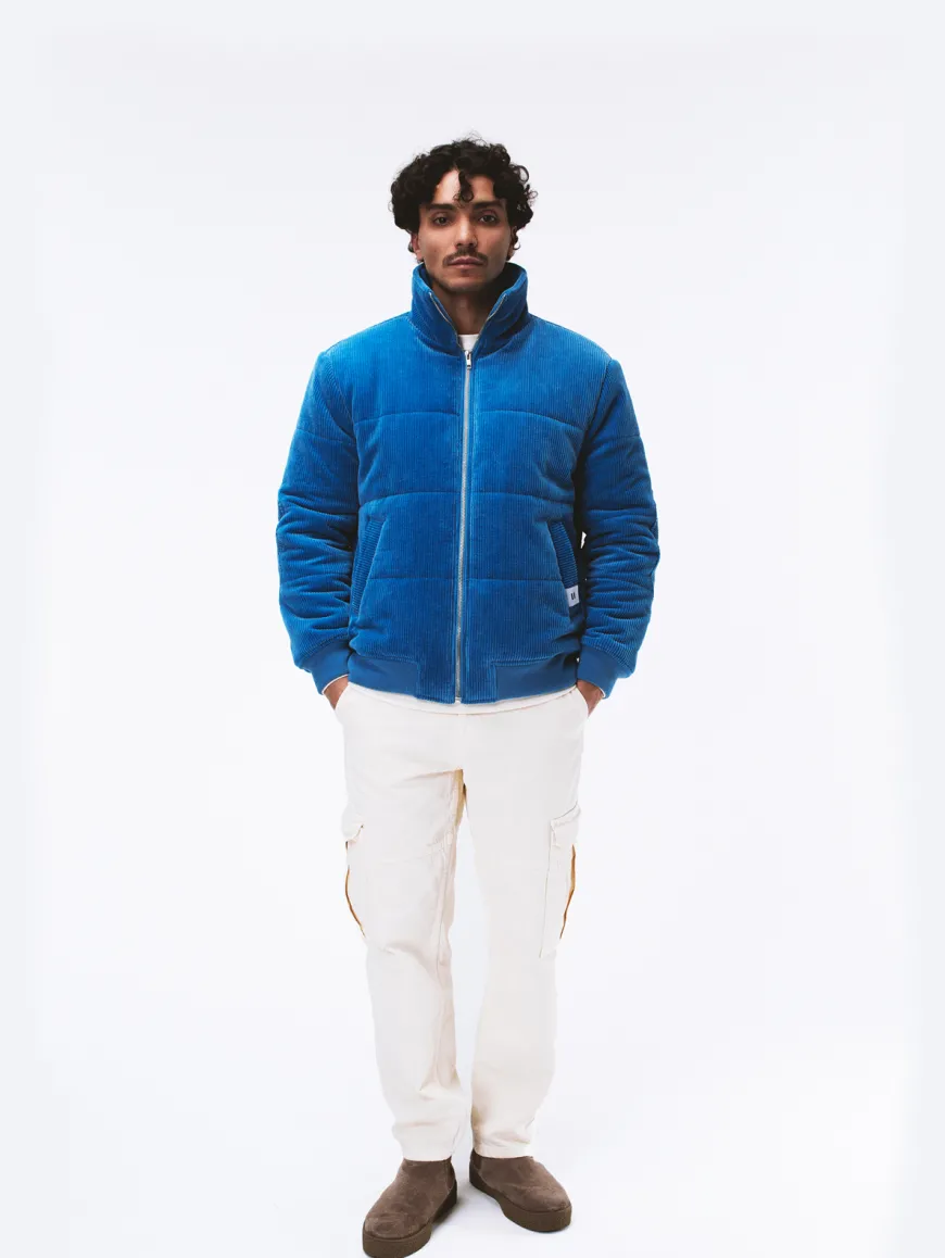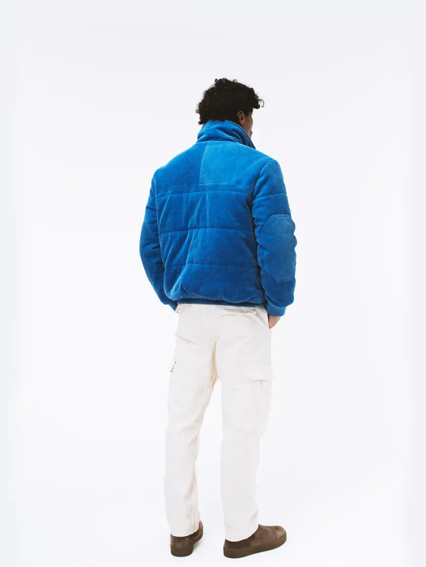 Doudoune puffer de la marque Côtelé en velours côtelé. Ronde et bien rembourrée, serrée à la taille et aux poignets avec un col camionneur qui remonte jusqu’en haut du cou. Velours grosses côtes 100% biologique tissé en France.