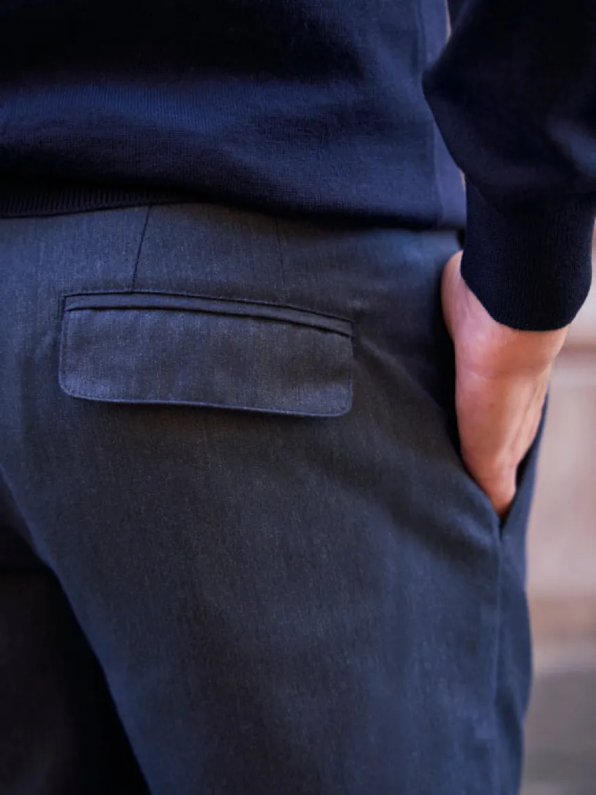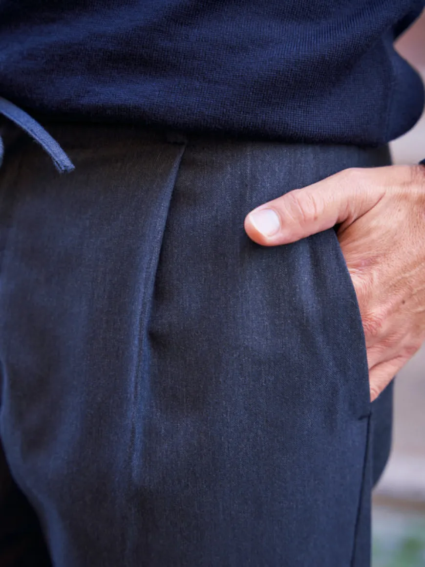 Le pantalon Gaston en laine et coton est décontracté et agréable à porter. Ses deux plis à l’avant apportent une touche d’élégance au style casual du pantalon. Il peut être porté avec une ceinture ou être resserré avec le cordon. Coupe légèrement fuselée.