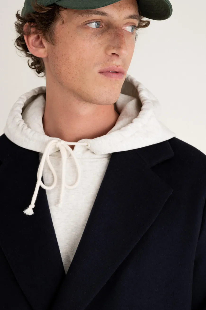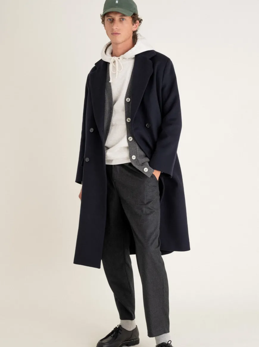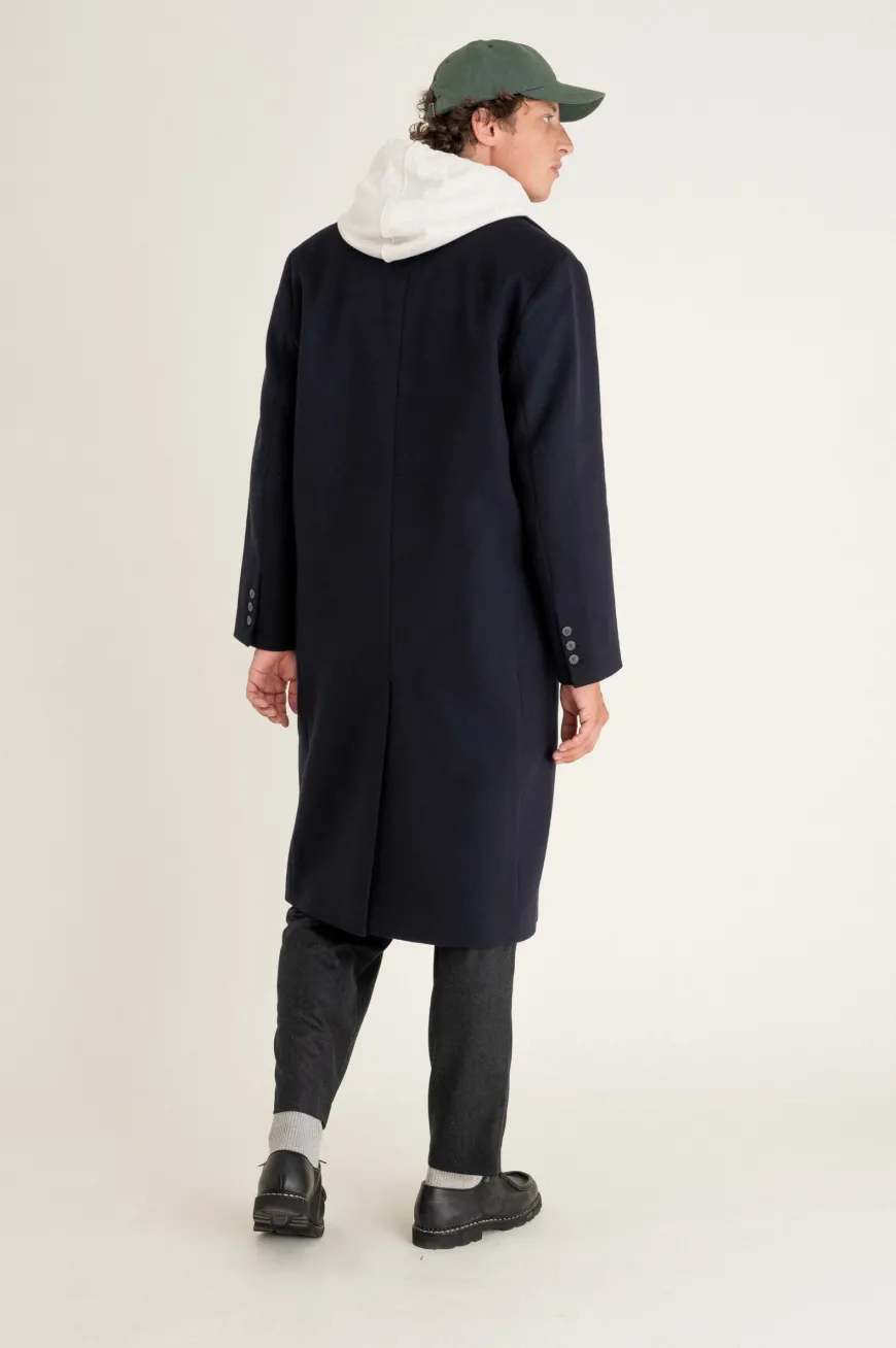 Manteau long à double boutonnage confectionné en drap de laine upcyclée. Entièrement doublé, il est composé d’un col cranté, de poches à rabats devant et d’une fente médiane dans le dos.