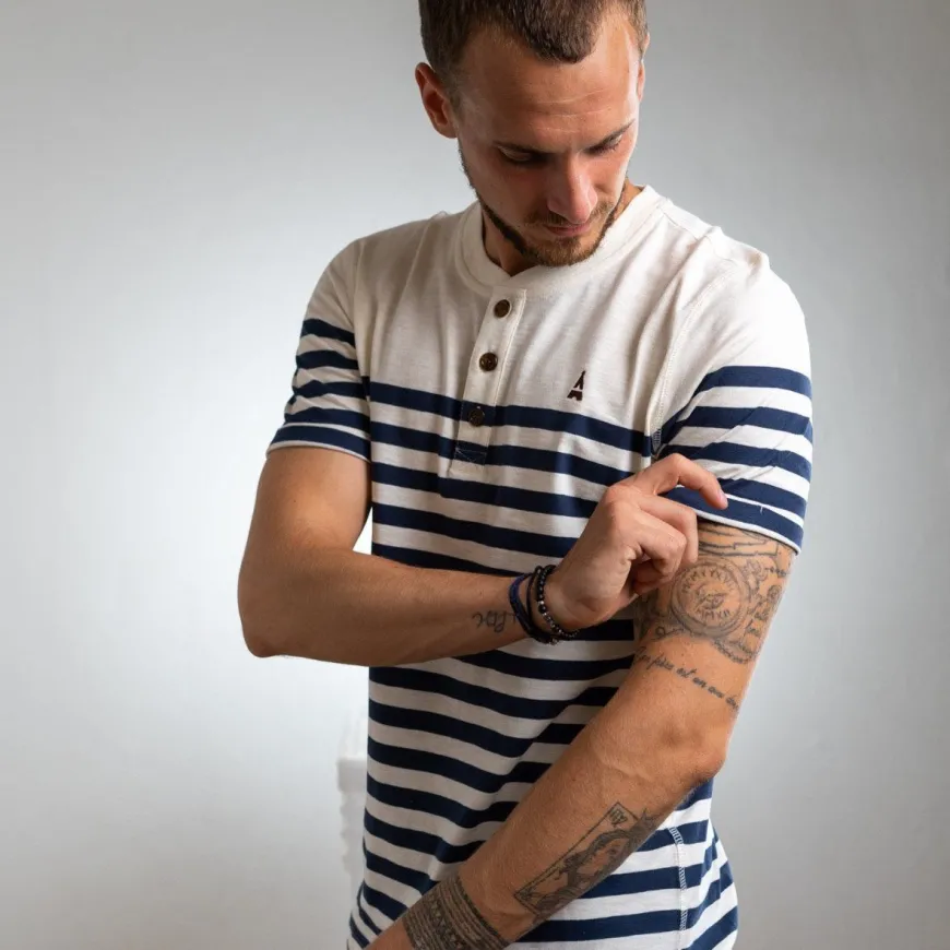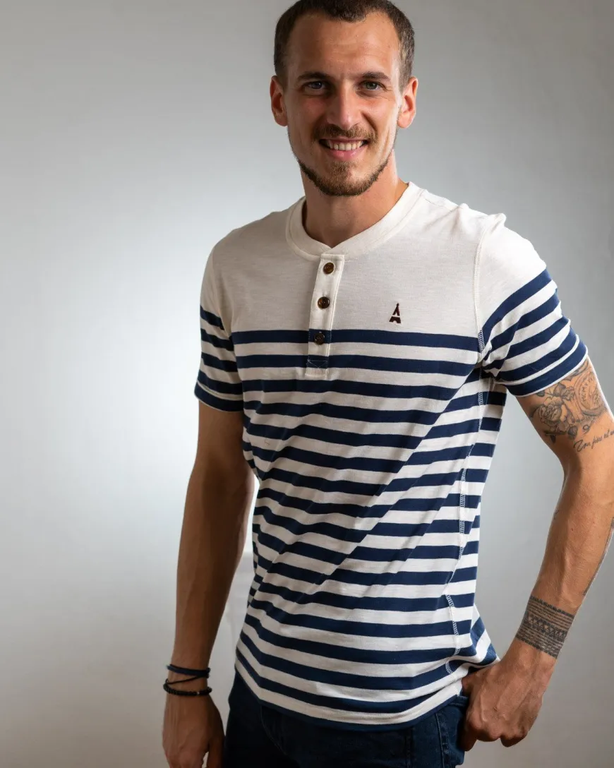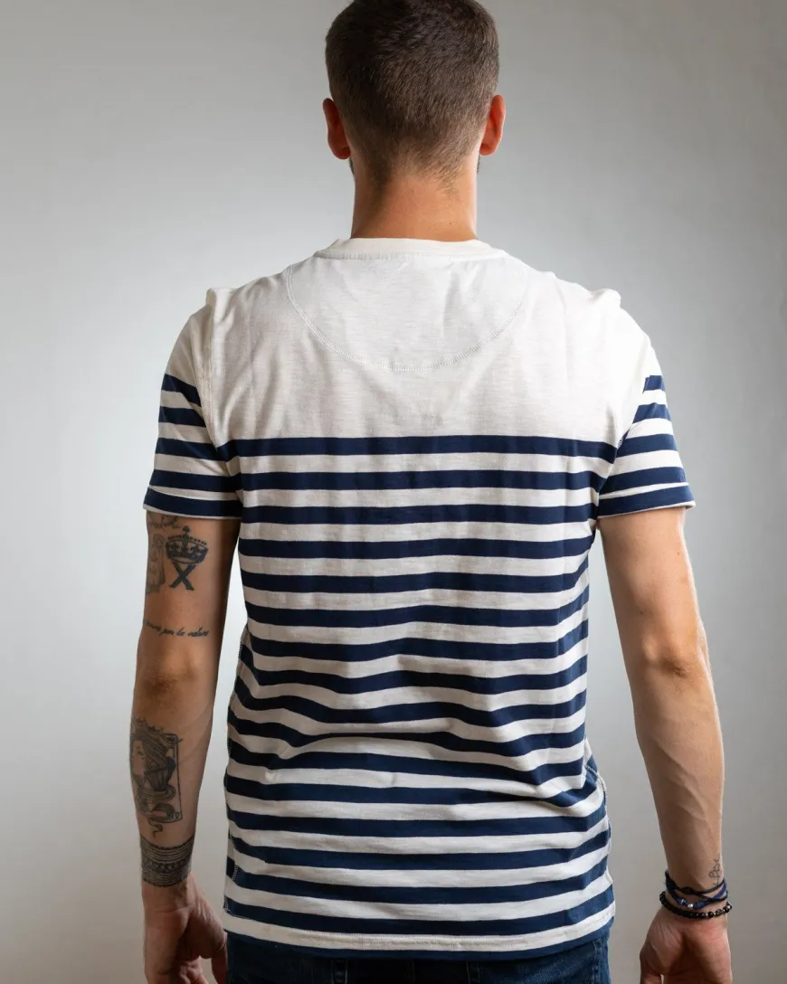 T-shirt marinière 100% coton bio, 180 g/m² de douceur. Pour info, ce T-shirt n’a parcouru en moyenne que 1580 kilomètres avant d’arriver dans votre armoire. Pas mal non ?