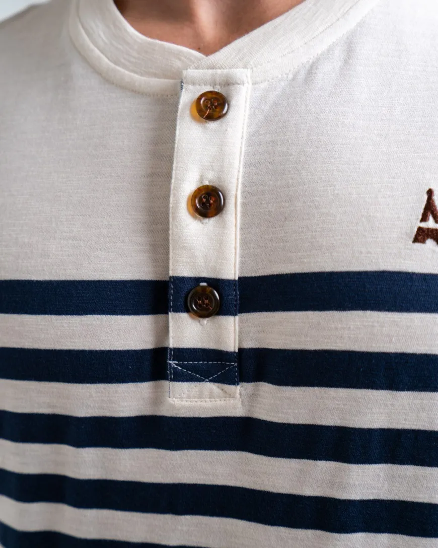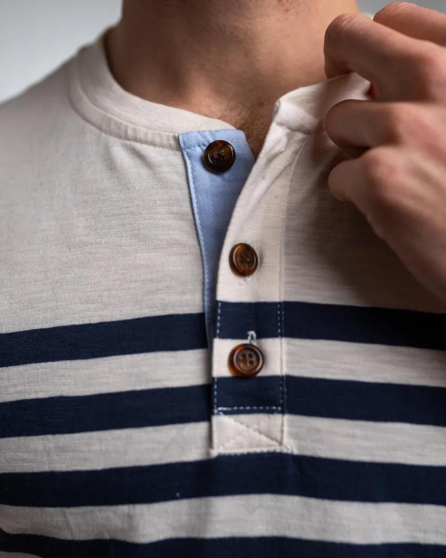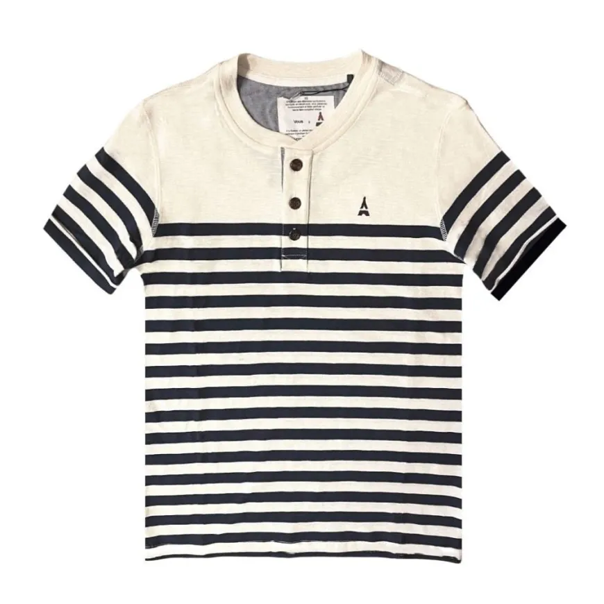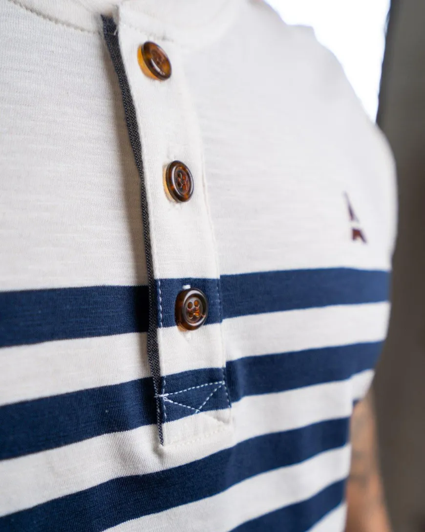 T-shirt marinière 100% coton bio, 180 g/m² de douceur. Pour info, ce T-shirt n’a parcouru en moyenne que 1580 kilomètres avant d’arriver dans votre armoire. Pas mal non ?