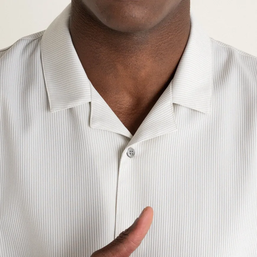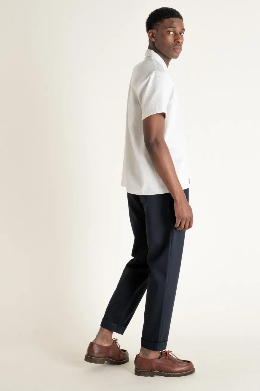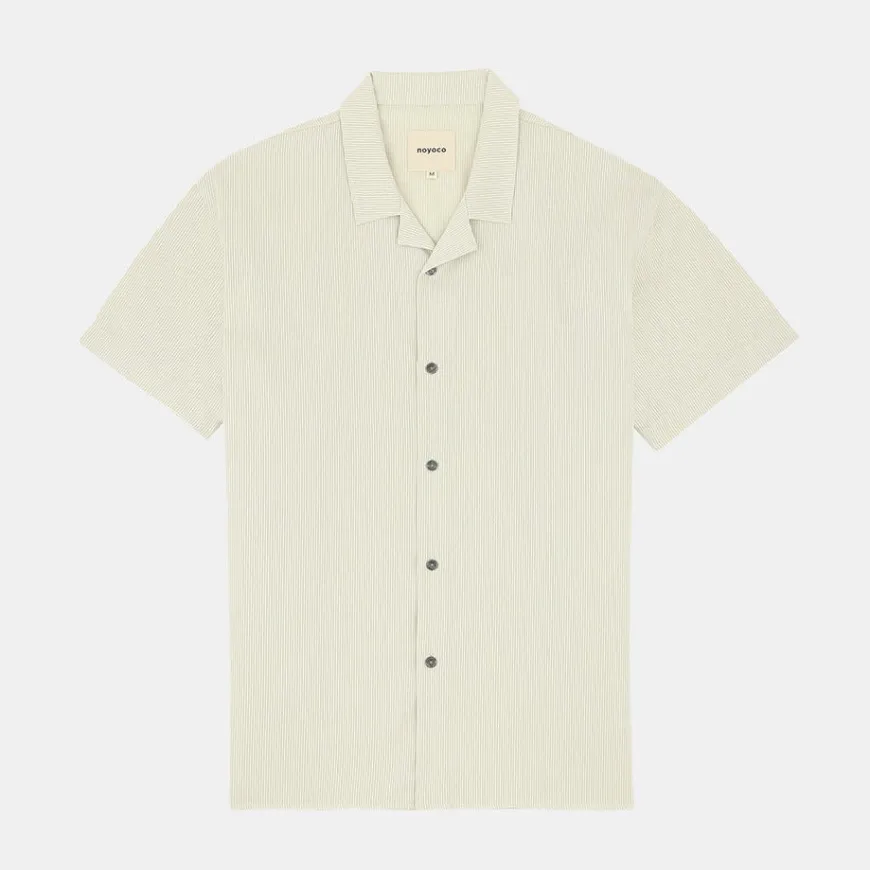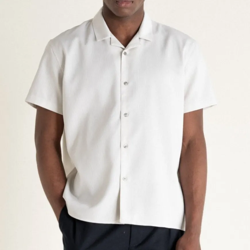 Chemise à manches courtes éco-responsable de la marque Noyoco. Fabriquée en Europe en coton upcyclé, cette chemisette au col requin est un must-have pour les beaux jours. Son petit côté 50s vous rendra beau.