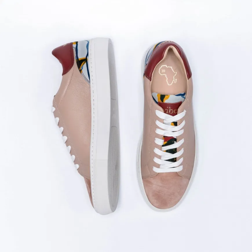 Version alternative plus colorée aux aficionados de baskets classiques, cette paire de baskets roses en cuir écologique saura vous séduire. Le tissu wax de Côte d’Ivoire utilisé au talon, signature de la marque, fait toute l’originalité de cette paire de chaussures !