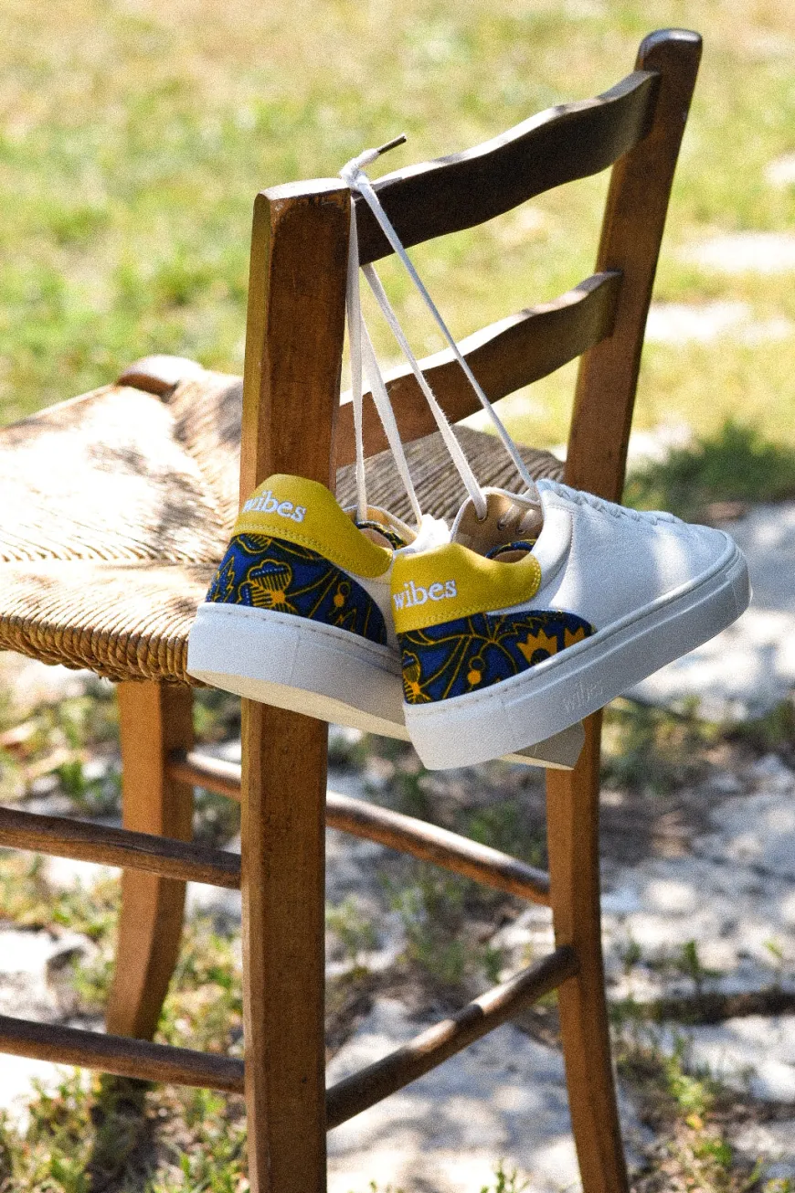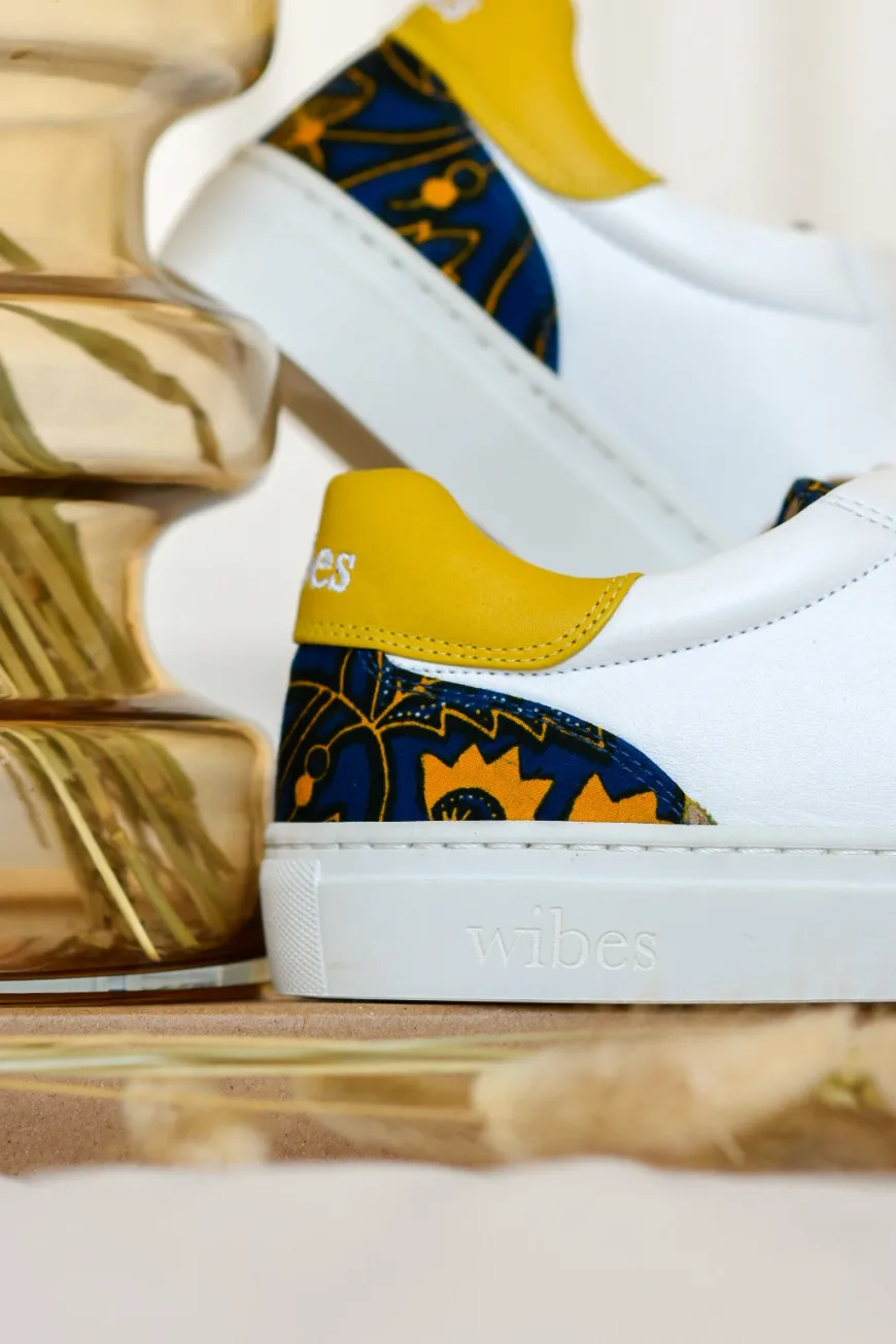 Les sneakers durables en cuir haut de gamme par Wibes. Elles sont épurées, sophistiquées, et interprètent avec énergie la sneakers urbaine. Signature de Wibes, la touche colorée de tissu Wax Ivoirien vient ensoleiller l’ensemble.