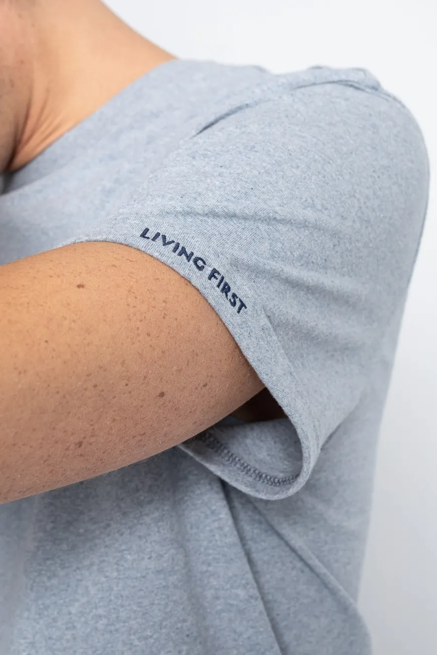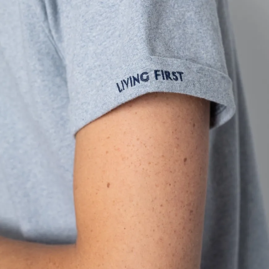 T-shirt en coton bio et coton recyclé de la collection Living First de la marque Jaqk. Un intitulé qui veut dire beaucoup en ces temps si particuliers. Living First est un appel à la vie, revendiquons-le !