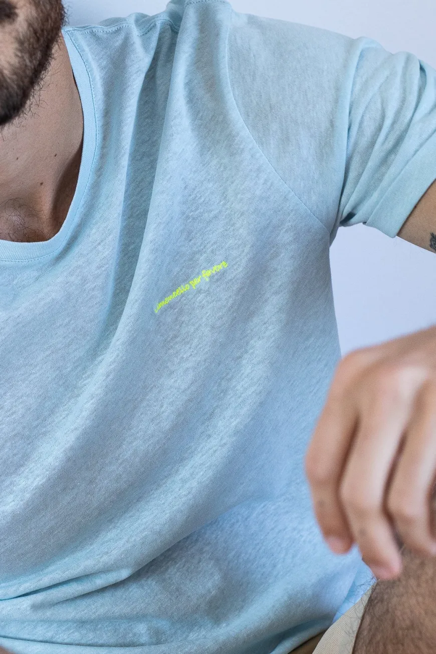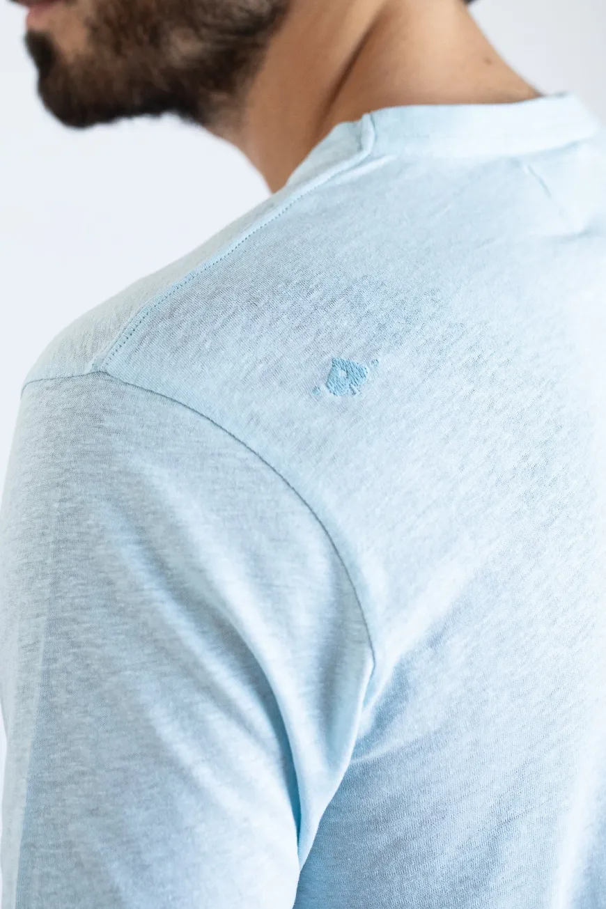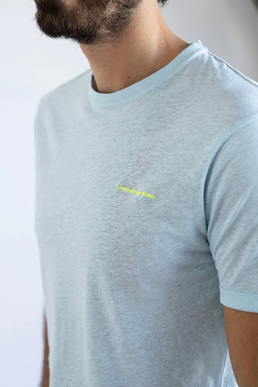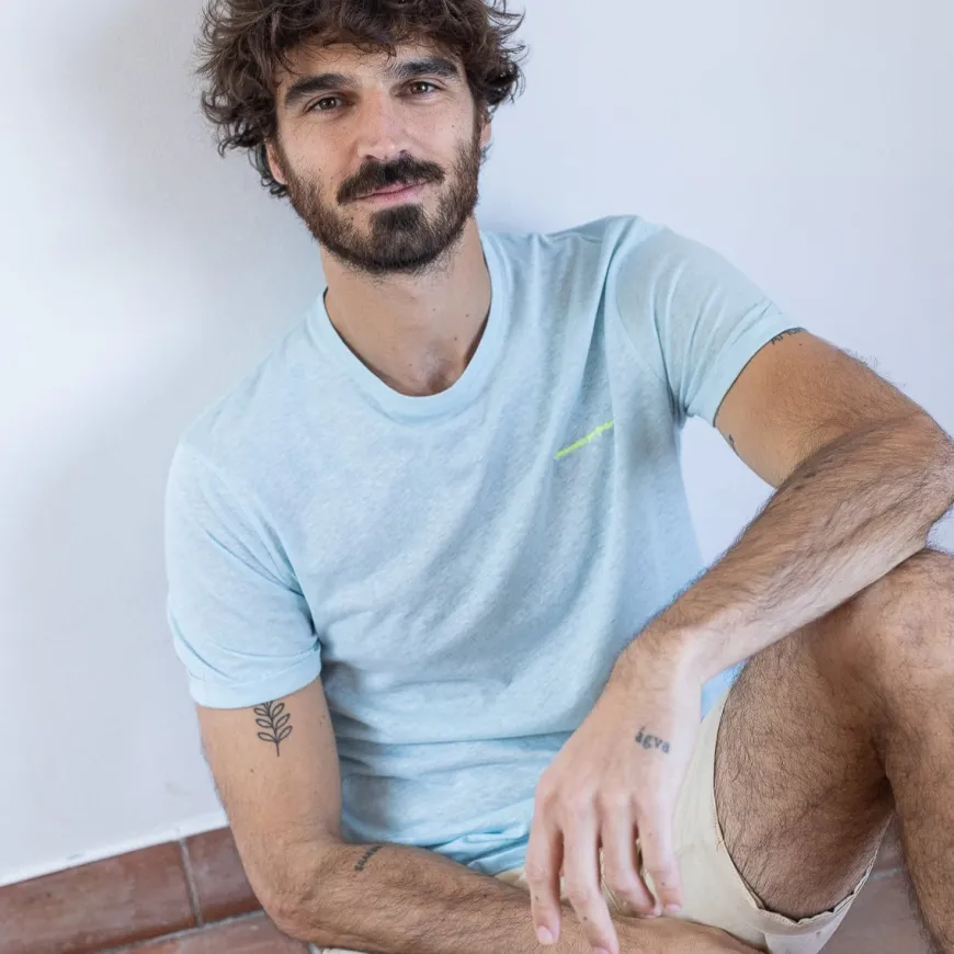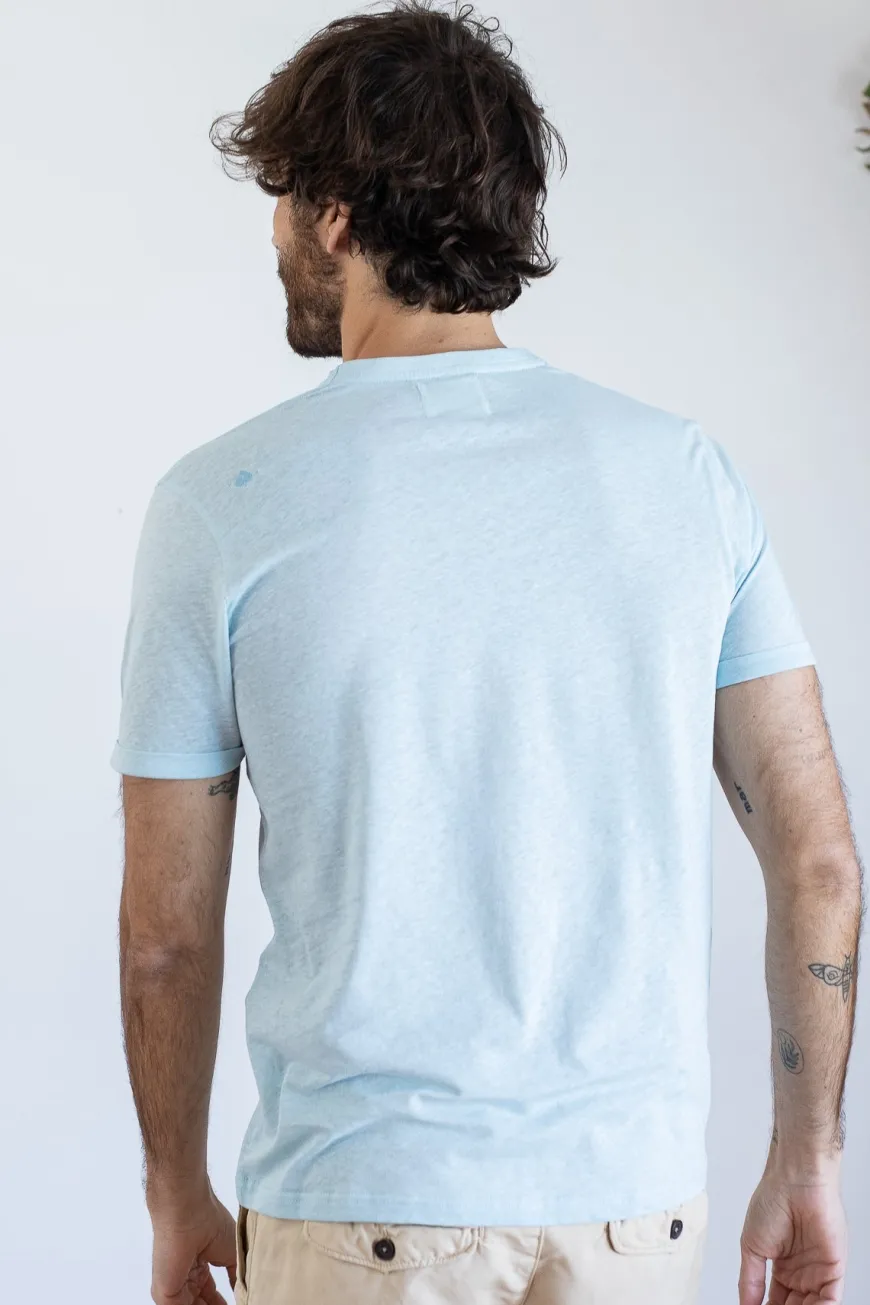 T-shirt bleu Franki en coton bio et lin de la marque Jaqk, fabriqué au Portugal. Parfait pour pavaner cet été !