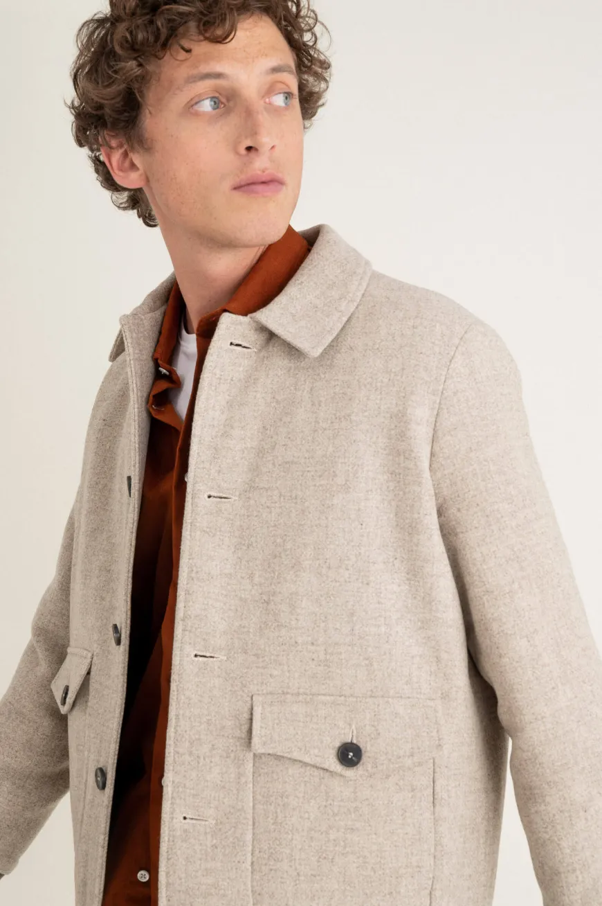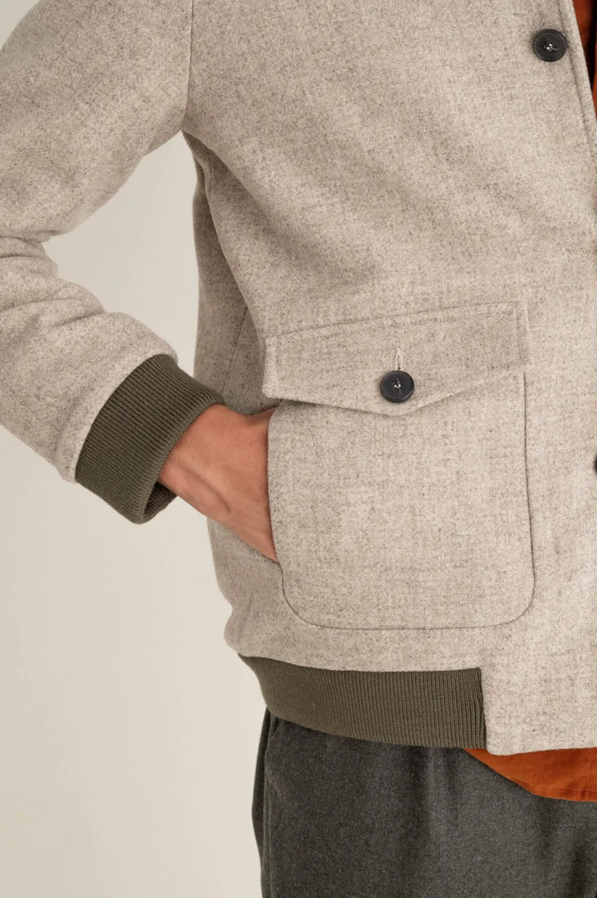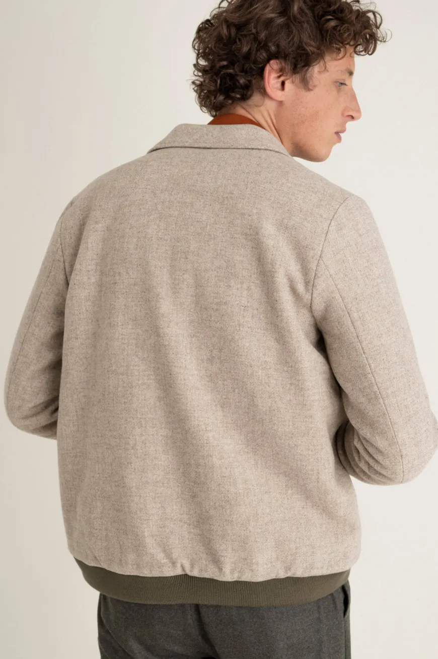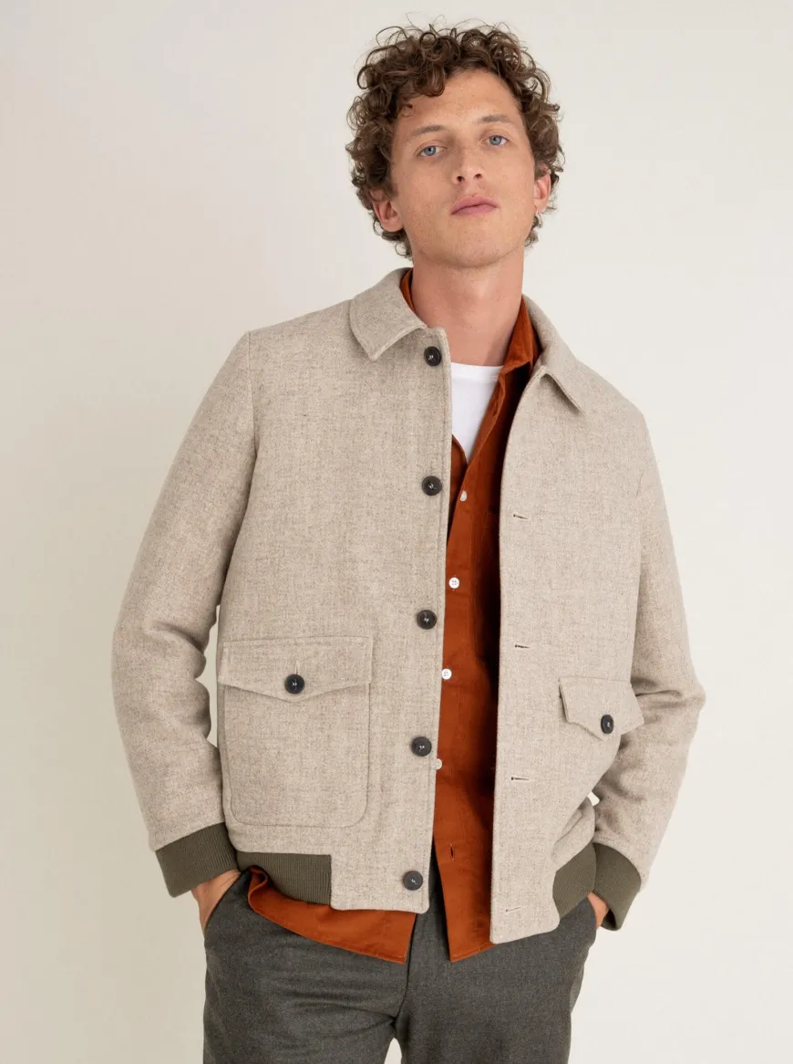 Confectionné dans un drap de laine et cachemire recyclés, ce blouson éco-responsable de couleur kaki va aiguiller vos jours d’automne et d’hiver.